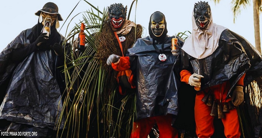 Os Caretas carnavalescos, tradição da Praia do Forte, localizada na cidade da Mata de São João, na Bahia.