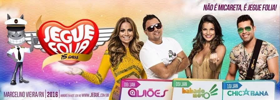 Agendado para os dias 08, 09 e 10 de janeiro de 2016, o Jegue Folia chega a sua 15ª edição e já confirmou as bandas Aviões do Forró, Babado Novo e Chicabana para se apresentarem no trio elétrico da Primeira do Brasil.
