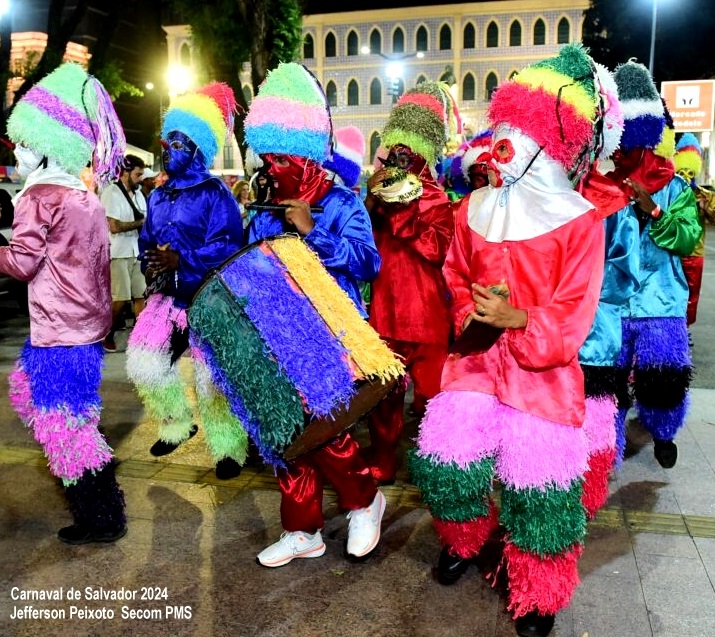 São mascarados que vestem roupas coloridas que desfilam com seus instrumentos musicais decorados e coloridos, pelas ruas das cidades da região do Baixo Sul da Bahia.